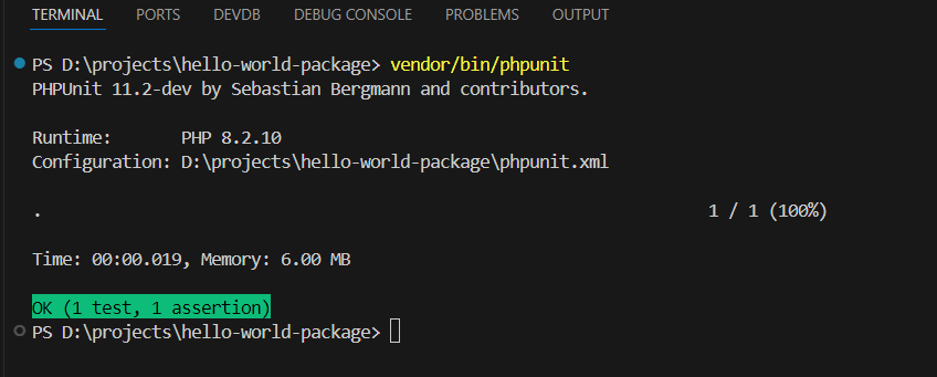Create a phpunit.xml file in the root directory of your hello-world-package to configure PHPUnit: